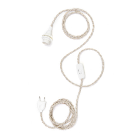 Das anschlussfertige Set enthält 3 Meter mit Baumwolle ummanteltes, gedrehtes Kabel, einen Schalter, einen Stecker und eine E14-Fassung.